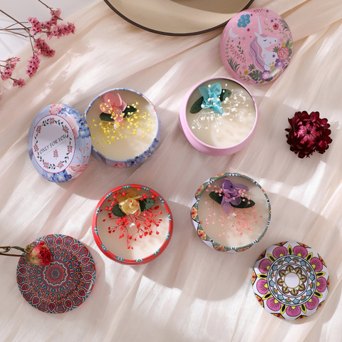 Logo personalizzato 2.6oz di lusso candele essiccate fiori Mini barattoli possono vasetto Private Label cera di soia profumata candele con coperchio in metallo